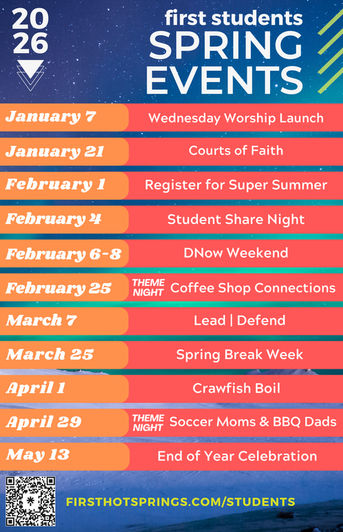 The student ministry at First Hot Springs is designed to encourage, support, and challenge students in their walk with Jesus. Every student who attends our Wednesday night service or Sunday morning Connect Groups will have an opportunity to hear the Gospel. We know that God’s word has the power to change lives, and we strive to live intentionally as vessels of His love.